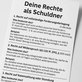 Wenn du Schulden hast, bist du nicht schutzlos. Das Gesetz gibt dir klare Rechte, mit denen du dich gegen unberechtigte oder überzogene Forderungen verteidigen kannst. Hier findest du alle wichtigen Punkte verständlich erklärt – mit den passenden Gesetzesbezügen.